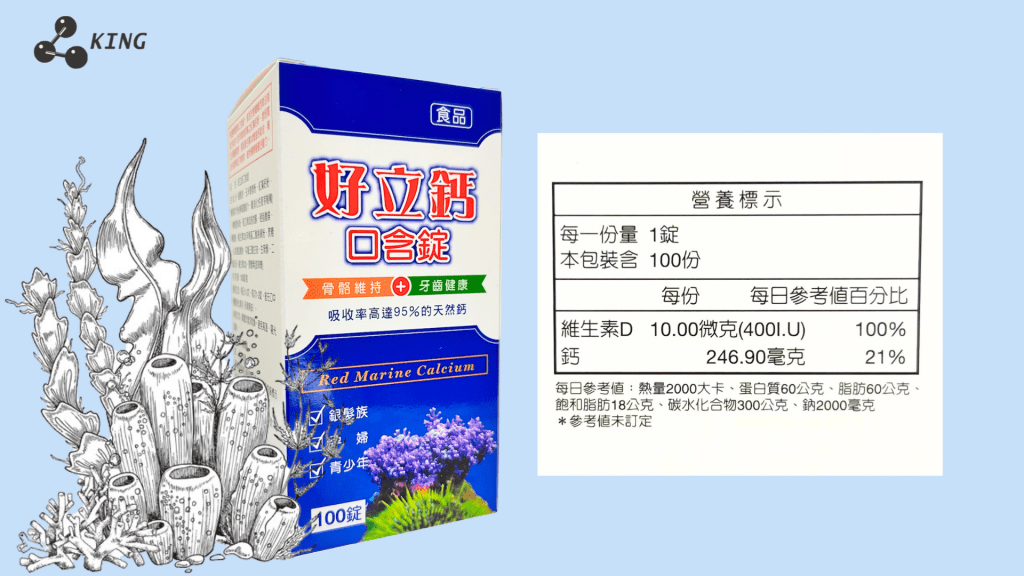 ⸺特選檸檬風味口含(嚼)錠,添加純淨愛爾蘭紅藻鈣粉,搭配D3增進鈣吸收。